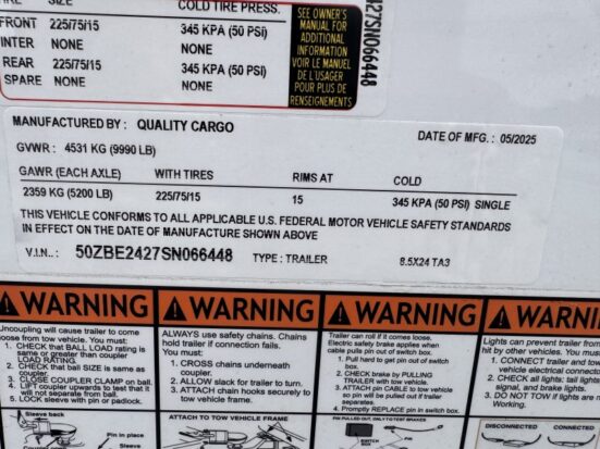 2025 Quality Cargo 8.5×24 Enclosed STD Ramp 10K –