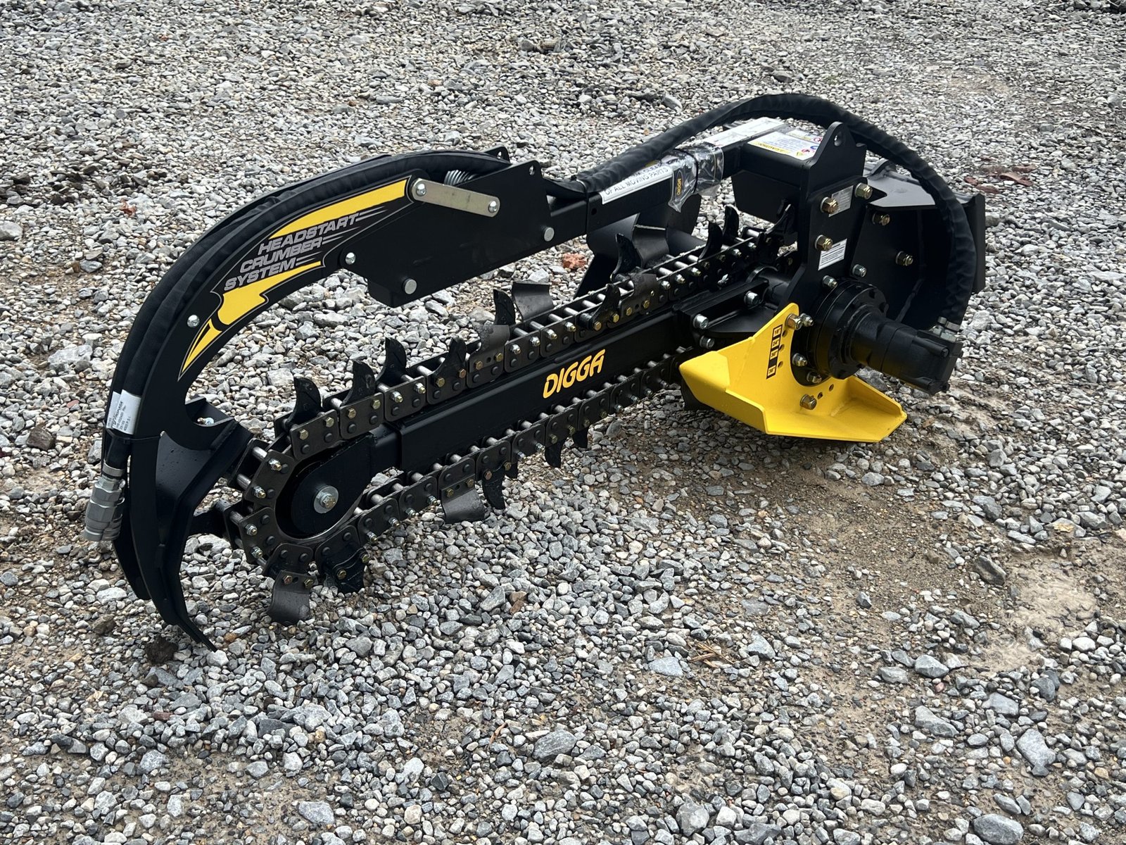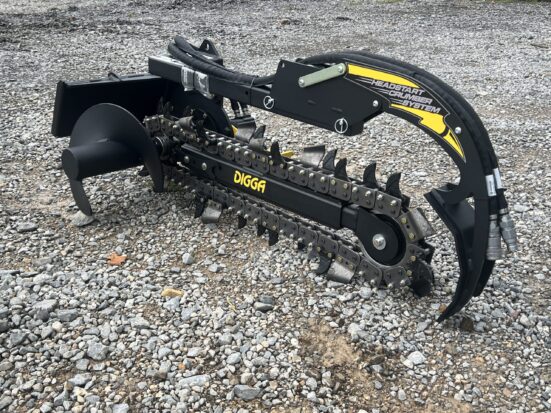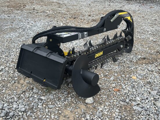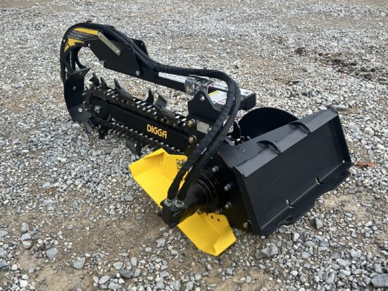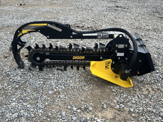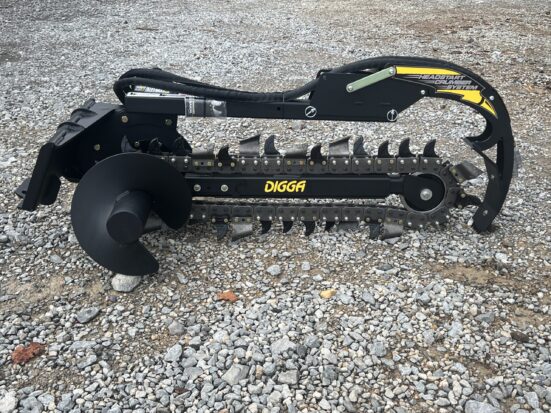 The Digga Bigfoot Mini Trencher is engineered for maximum efficiency and productivity in tight spaces. With a 36” digging depth and 6” cutting width, this trencher is ideal for irrigation, drainage, landscaping, and utility installations. Equipped with Digga’s Combination Chain configuration (cup teeth and tungsten shark teeth), it is suitable for most applications. Will cut through hard soil, roots, soft shale, and rocky conditions. The adjustable depth control foot ensures precise trench depth every time, while the patent-pending crumber bar starts in the trench—eliminating the need for manual resets. This model features the Mini Universal style mounting system, making it compatible with popular mini skid steer loaders including Toro Dingo, Thomas, Ditch Witch, Vermeer, Finn, Ramrod, Boxer, and many others. Key Features: Mini Universal style mounting system fits Toro, Thomas, Ditch Witch, Vermeer, Finn, Ramrod, Boxer & more Adjustable depth control foot for consistent trenching depths Combo Chain (Earth Teeth and Tungsten Shark Teeth) – Suitable for most conditions Patent-pending crumber bar starts in-trench for faster, safer operation Foot design visible from the cab for accurate positioning Complete trenching solution for clean trenches and improved productivity Heavy-duty construction with Eaton hydraulic motor for long life Compact design ideal for mini skid steer loaders and tight work areas Specifications: Cutting Depth: 36″ Cutting Width: 6″ Chain Type: Combo Chain (Cup Teeth and Tungsten Shark Teeth) Depth Presets: 18″, 24″, 30″, 36″ Hydraulic Flow Required: 10–25 GPM Hydraulic Motor: 2K Bell Eaton Max Pressure: 3,500 PSI @ 16 GPM Max Flow: 25 GPM @ 2,900 PSI Max Continuous Power: 34 HP Length: 74″ Height: 32″ Width: 38″ Weight: 536 Pounds Mounting Style: Mini Universal (Toro Dingo style) The Digga Bigfoot Mini Trencher is engineered for maximum efficiency and productivity in tight spaces. With a 36” digging depth and 6” cutting width, this trencher is ideal for irrigation, drainage, landscaping, and utility installations. Equipped with Digga’s Combination Chain configuration (cup teeth and tungsten shark teeth), it is suitable for most applications. Will cut through hard soil, roots, soft shale, and rocky conditions. The adjustable depth control foot ensures precise trench depth every time, while the patent-pending crumber bar starts in the trench—eliminating the need for manual resets. This model features the Mini Universal style mounting system, making it compatible with popular mini skid steer loaders including Toro Dingo, Thomas, Ditch Witch, Vermeer, Finn, Ramrod, Boxer, and many others. Key Features: Mini Universal style mounting system fits Toro, Thomas, Ditch Witch, Vermeer, Finn, Ramrod, Boxer & more Adjustable depth control foot for consistent trenching depths Combo Chain (Earth Teeth and Tungsten Shark Teeth) – Suitable for most conditions Patent-pending crumber bar starts in-trench for faster, safer operation Foot design visible from the cab for accurate positioning Complete trenching solution for clean trenches and improved productivity Heavy-duty construction with Eaton hydraulic motor for long life Compact design ideal for mini skid steer loaders and tight work areas Specifications: Cutting Depth: 36″ Cutting Width: 6″ Chain Type: Combo Chain (Cup Teeth and Tungsten Shark Teeth) Depth Presets: 18″, 24″, 30″, 36″ Hydraulic Flow Required: 10–25 GPM Hydraulic Motor: 2K Bell Eaton Max Pressure: 3,500 PSI @ 16 GPM Max Flow: 25 GPM @ 2,900 PSI Max Continuous Power: 34 HP Length: 74″ Height: 32″ Width: 38″ Weight: 536 Pounds Mounting Style: Mini Universal (Toro Dingo style)